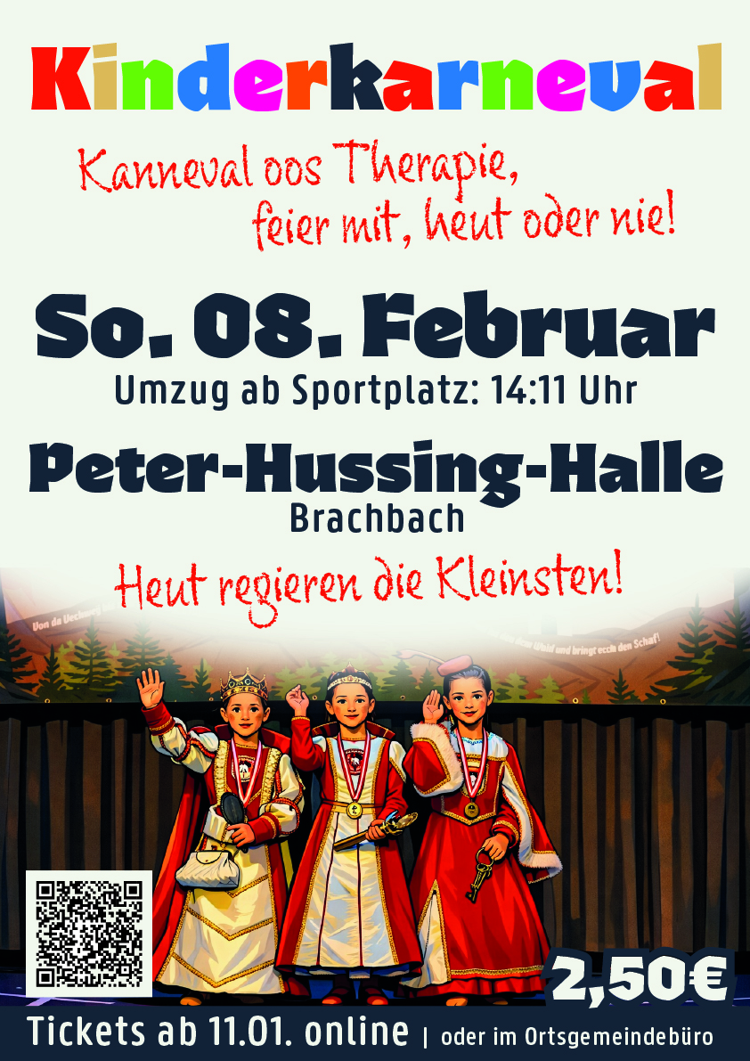 Am Tag nach der Sitzung lädt das Kinderdreigestirn den Nachwuchs zum Feiern ein. Um 14:11 Uhr setzt sich der Kinderkarnevalszug am Sportplatz in Bewegung und steuert die zartlachsrosa Hussinghalle an. Hier gibt es dann den ganzen Nachmittag ein buntes Programm für den Nachwuchs: Tänze, Spaß und gute Laune und zum Abschluss natürlich das traditionelle Kamellewerfen. Weil der Kinderkarneval immer sehr zügig ausverkauft ist empfehlen wir, sich schnellstmöglich ein Ticket zu sichern. Die gibt es online ab 11.01. hier zu kaufen.